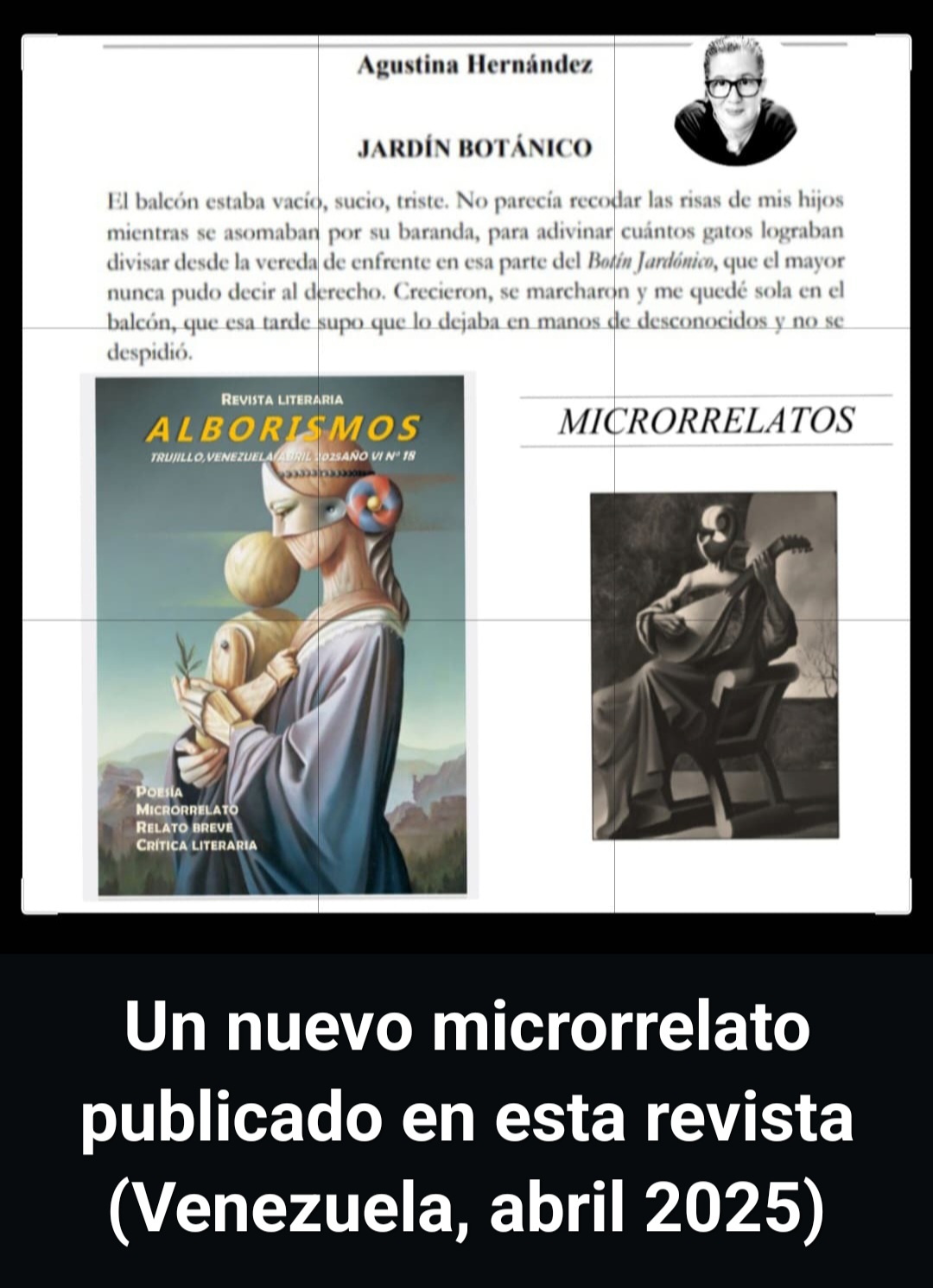 En el mes de abril de 2025, su microrrelato "Jardín botánico" fue publicado por la revista "Alborismos" (Venezuela).